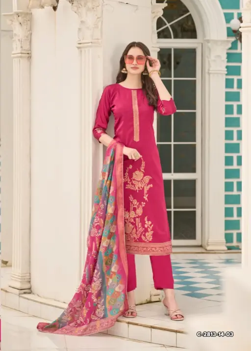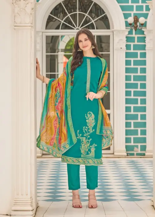 - Top Fabric: Premium Dola Jacquard Designer Suit With Elegant Hand Work