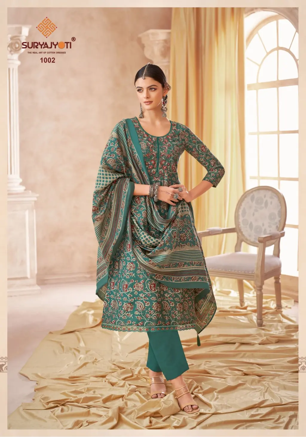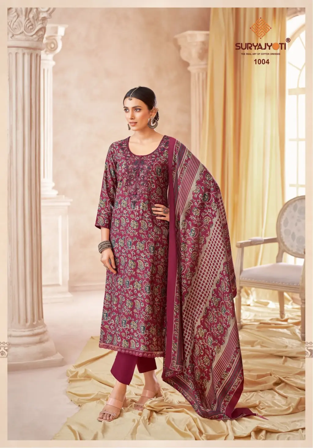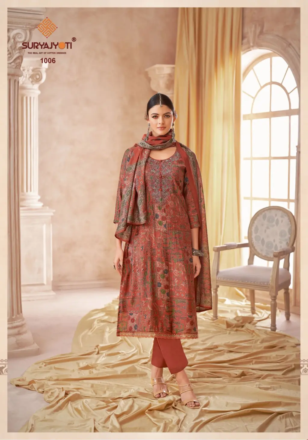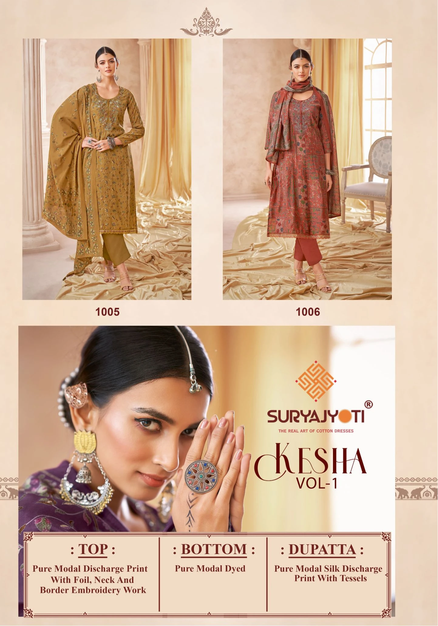 - Top Fabric: Pure Modal Discharge Print With Foil,Neck And Border Embroidery Work